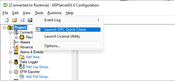 To allow this open the "KEPServerEX 6 Configuration" and from the menu "Tools" select "Launch OPC Quick Client":