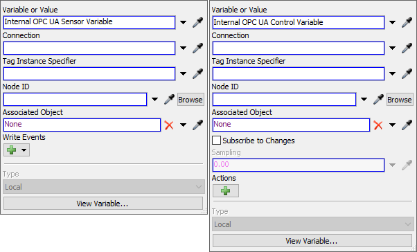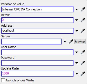 If you choose to point a Process Flow Variable at an internal Emulation Connection or Variable, the properties of the Process Flow Variable will update to show one of the following options: