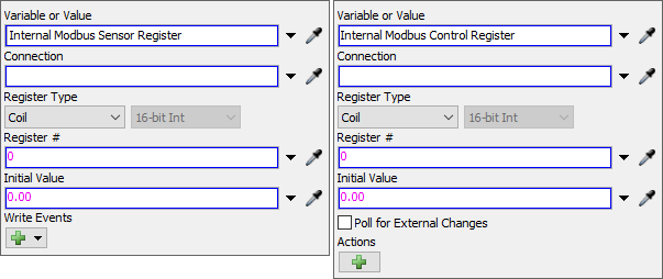 The properties for the modbus register internal variable are the same as in the Emulation tool. For information about these properties, see the Emulation page.