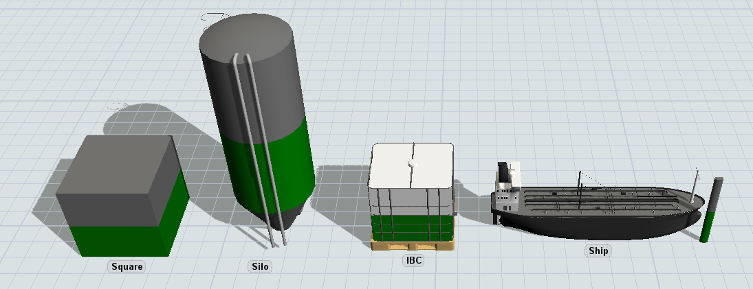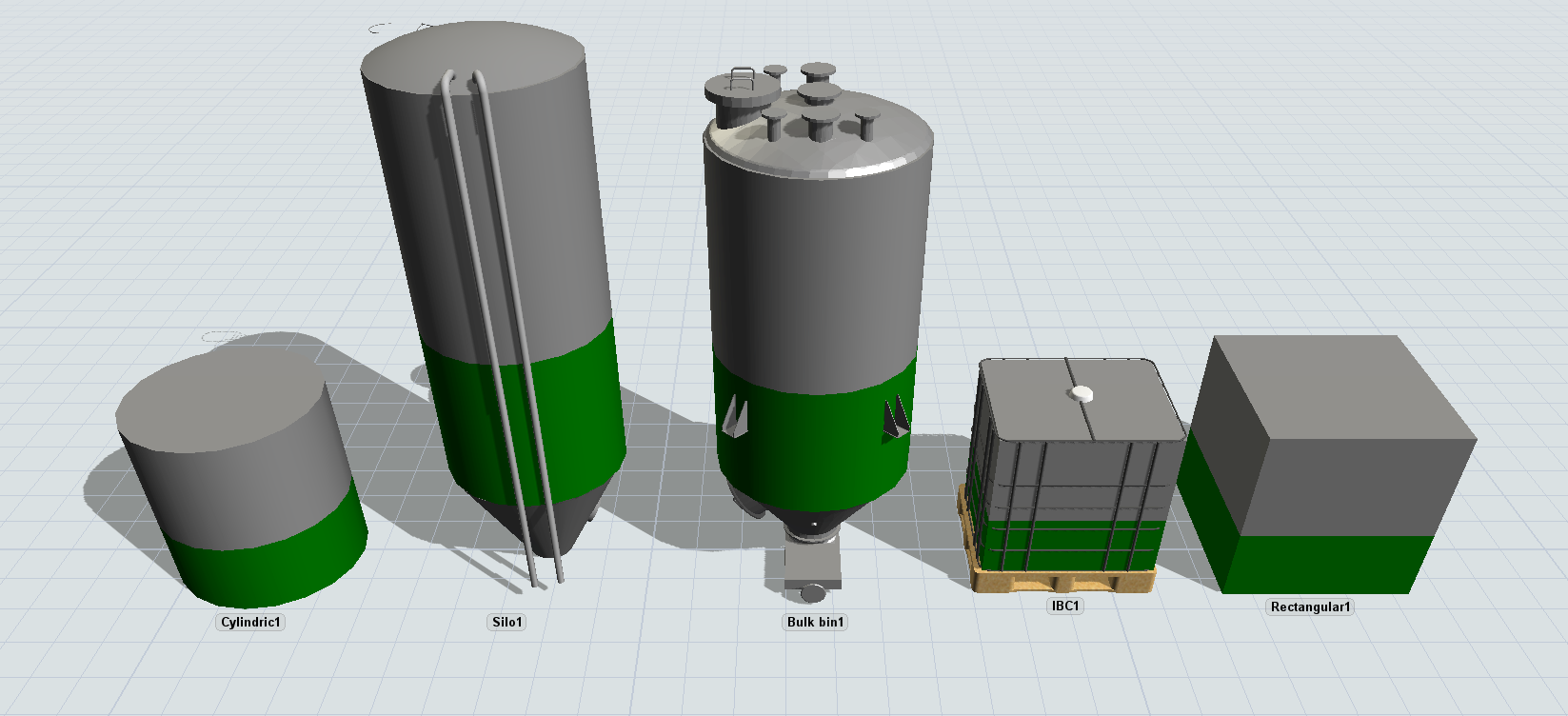 By default the flow tank is modelled as a cylindrical or rectangular container, depending on the shape of the level indicator. FloWorks provides a few additional visualizations on top of this base shape, such as a silo, bulk bin or intermediate bulk container (IBC). These shapes can be selected when adding a tank to the model by clicking instead of dragging the Flow Tank object in the Library, or set on an existing tank using the Shape panel in the properties window.