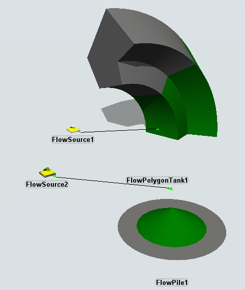 In some cases you may want to model the geometry of a real-life situation in more detail. For example, you may be releasing bulk material onto a pile which settles into a conical shape. Or you may be filling a specific shape with a polygon surface area, in coastal protection construction. FloWorks provides two specific versions of the flow tank, which are functionally identical to the regular flow tank but provide a different in the geometry. Therefore their Settings Tab will vary slightly. This applies to the "pile" and "polygon" shapes. You can select these options just like the other shapes mentioned above, but instead of using a standard cylindrical or rectangular level indicator, they will use special internal logic to draw their contents, to provide a more realistic visualization.