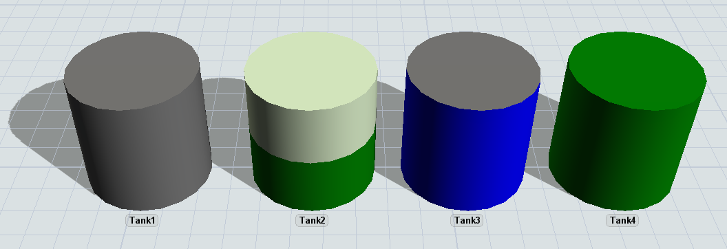 All content-holding objects, such as tanks and mixers, have a system for displaying the current content of the objects as a percentage of the maximum content. This system colored bar is called the level display or level indicator. The Tank and Mixer have no 3D shape by default and only use this bar to visualize the object. The bar consists of two layers. The bottom layer represents the current content of the object using the color of the product it contains. The top layer uses the object's color (usually, dark gray) to represent the amount of empty space left in the object. If a bar is displayed as fully gray, that object is empty. If a bar is fully colored, including the top cap, that object has reached its full capacity.