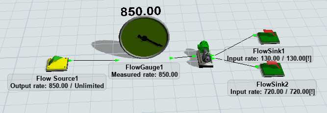 The Flow Gauge is a special type of Flow Processor which visualizes the total flow that passes through it. You should place it "in series", typically it will have a single connection in and a single connection out (though it can have multiple connections and will then behave as a Flow Processor with Preferred order flow).