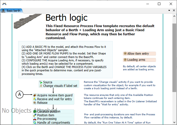 FloWorks provides a Process Flow Template that makes a Basic FR and a (set of) flow pump(s) mimick the basic behavior of a Loading Point with one or more loading arms connected. You can use this template in those cases where the built-in functionality of the loading point and loading arm are too restrictive, for example if you have complex berth assignment logic. The template can be added from the Process Flow button on the toolbar, in the FloWorks submenu, and contains instructions for using it in the Process Flow itself.