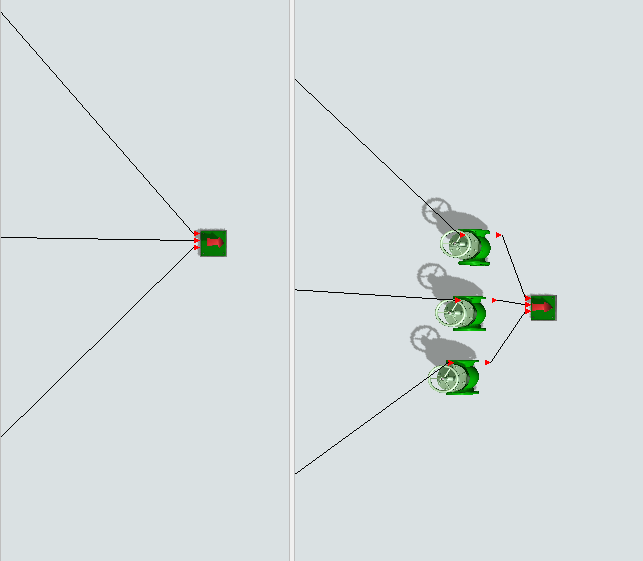 The splitter does the same on the output side: it has its output rule set to "Balanced flow on rate %" by default. It always makes sure it is releasing the correct percentages. If the outflow rate is reduced on one of the output ports, all other ports will be reduced to keep the ratio between the outflow rates fixed. This implies in particular that if a downstream object is blocking on one output port, that the splitter will also stop the flow through all other output ports.