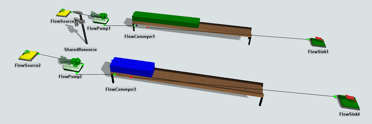 No material flows through the shared resource object itself. Rather, the shared resource is added to the model as a separate object; the objects it restricts (its members) are linked to it through the properties page of the shared resource. All objects for which the inflow and outflow are always equal can be members of the shared resource. This includes pumps, valves, sources and sinks. The sum of all these flows will be enforced to be less than or equal to the maximum capacity of the shared resource object. To be able to do this, all members of the shared resource must be attached to the same flow control. Which flow will be reduced first is determined by the order in which objects are attached to the flow control. In principle this decision is made automatically, however it can be influenced by re-ordering flow ports before recalculation of the flow rates.
