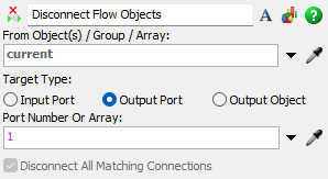 - As (list of) input port number(s). For the target, you should specify an input port number or a list of input port numbers (see below). The incoming connections to the "Disconnect From" object(s) at that specific input port(s) will be disconnected.