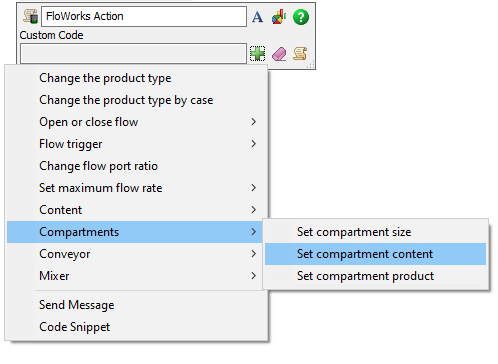 It has a different icon to distinguish FloWorks actions from other Custom Code activities. In addition the list of dropdown options in the Custom Code field is geared towards FloWorks actions, as shown in the screenshot below.