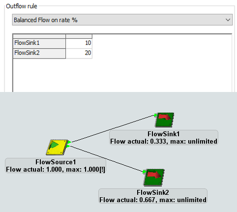 For example, the model was created by connecting a flow source with a maximum output rate of 1 to two unconstraining flow sinks. To ensure that the flow is divided with one third going to the first sink and two thirds going to the second, we set the outflow rule to "Balanced Flow on rate %" with a ratio of 1 to 2. Other values that would have produced the same model would be 10 and 20, 0.3 and 0.6, 33 and 66 or any other two numbers with the same ratio.
