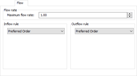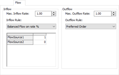 The flow tab may slightly change shape depending on the object whose properties you are editing. For example, the flow pump is not designed for use as a splitter or blender - there are separate objects to do precisely that - so its inflow and outflow rule will be fixed to "Preferred Order".