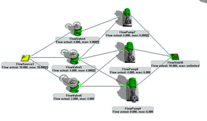 The valve at the top, FlowValve4, is only connected to one object, FlowPump7. The latter has a maximum capacity of 6 so it gets the full capacity on its first input port. The remaining capacity of 2 can be provided by the second valve, FlowValve5, since FlowPump7 is connected to its first output port and thus has highest priority. The remaining flow of 2 on FlowValve5 goes to FlowPump8 on the second output port, leaving nothing for the final pump FlowPump9.