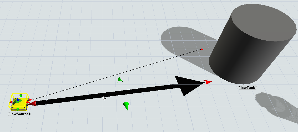 By default arrows are drawn on top of the regular FlexSim connections (even if the latter have been switched off). You can customize the relative size and position of these arrows, once you have switched them on. When you click an arrow, FlexSim's green and red "resize cones" will appear in two dimensions. You can use these to change the size of the arrow. Drag the arrow to change its position relative to the two FloWorks objects. If you want to change the start or end point of the arrow, hold the X button on your keyboard while dragging one of the arrow's extremes.