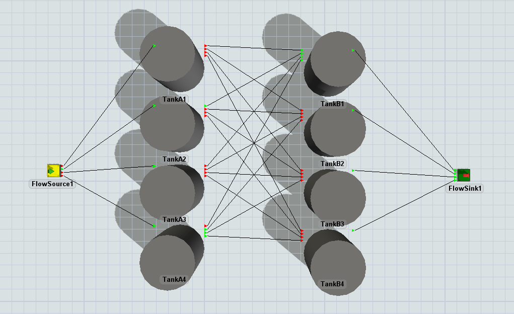 In fact, the network can potentially be reduced to nothing more than a source connected to a sink (specifically, this happens when the maximum inflow and outflow rates of the tanks are non-constraining).