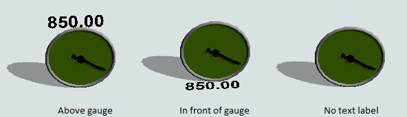 - In front of gauge - The text label is shown in front of the dial, perpendicular to the gauge (normally in the same plane as the model floor).