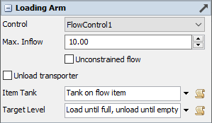 By default, a loading arm in "Load transporter" mode will continue loading the flow item tank until it reaches its maximum capacity; if the "Unload transporter" checkbox is checked the loading arm will let the flow