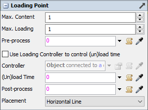 The checkbox determines whether the loading point has a predetermined (un)loading time or whether an external loading controller, such as a loading arm or multi-compartment loading controller, will control the (un)loading duration. If the Loading Controller option is enabled, the default option is to use the first object connected by center port ('S'-connection) to the Loading Point.