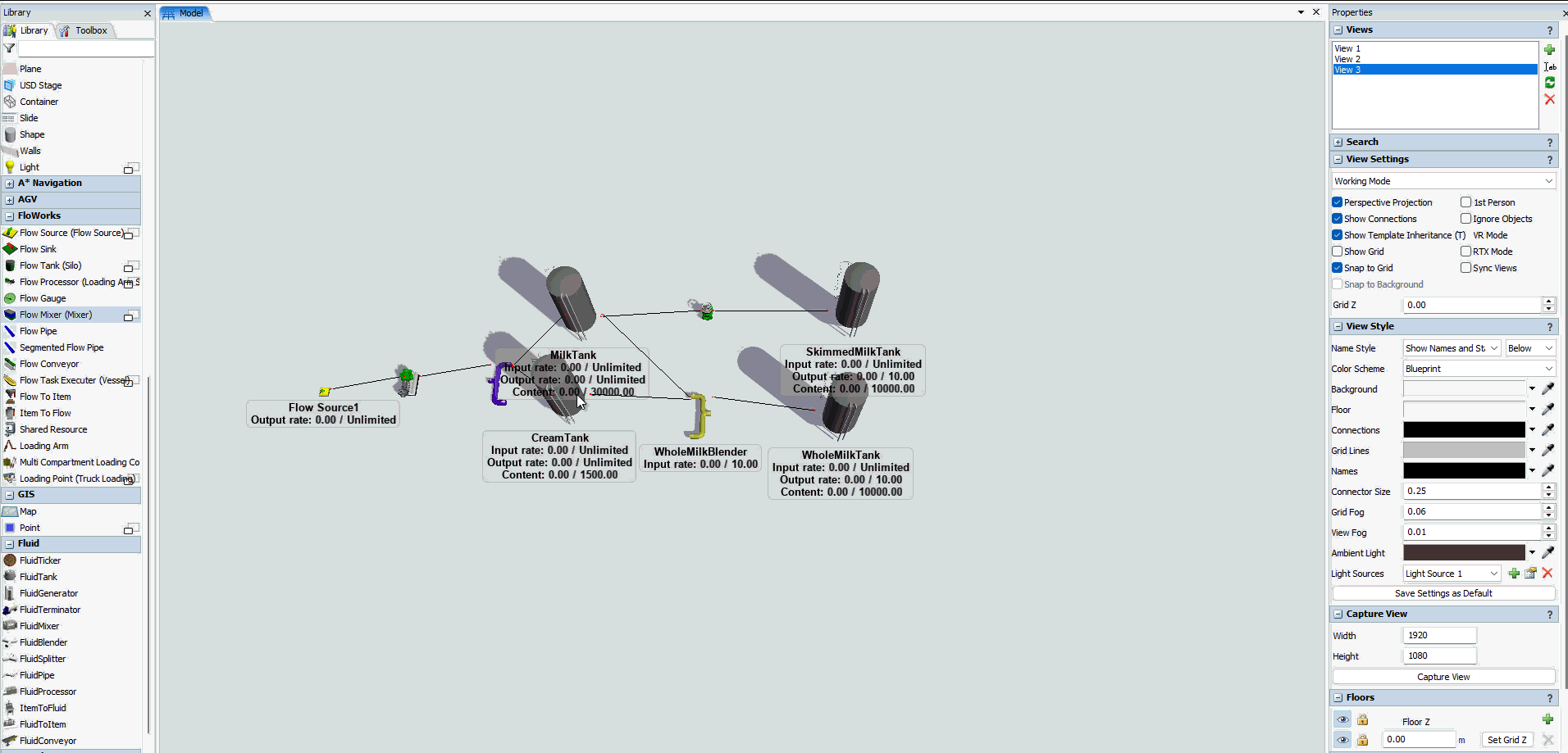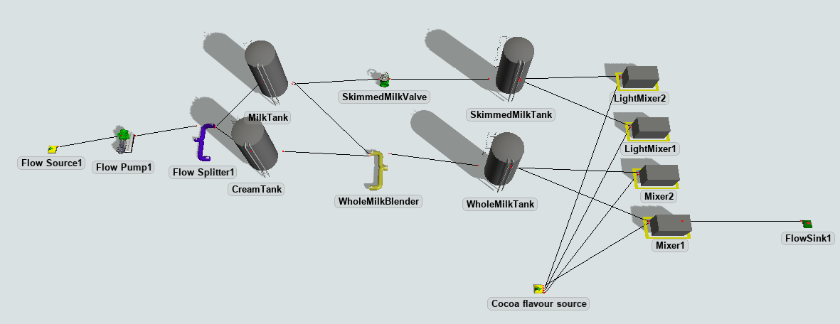 Add a flow mixer to the model, and connect the whole milk tank to it, then the cocoa source. We are not interested in the subsequent process, so connect the mixer to a sink.