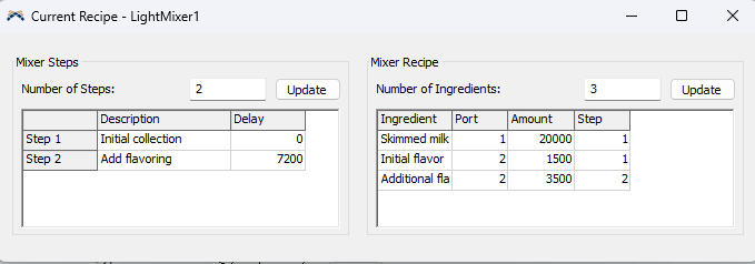 Click the "Edit Steps" button behind "Current Recipe" to enter the recipe for chocolate milk. Add two steps by entering 2 as the Number of steps and clicking the Update button next to it. Name step 1 “Initial collection” and enter a Delay of 3,600 (1 hour, assuming you have chosen seconds as the time units for your model). For step 2, enter “Add flavoring" as the description with a post-step delay of 7,200 seconds.