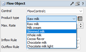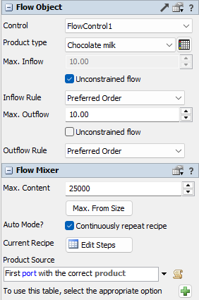 Assume that we have a non-limiting supply of cocoa flavor. Add a flow source to the model with a flow rate of 2 L/s and set the product type to Cocoa flavor. The recipe for chocolate milk is as follows: