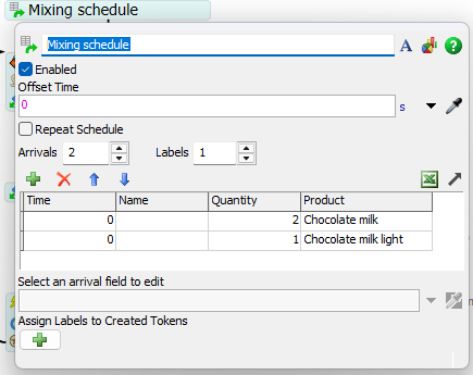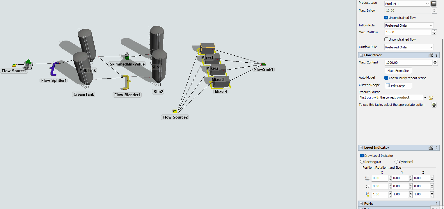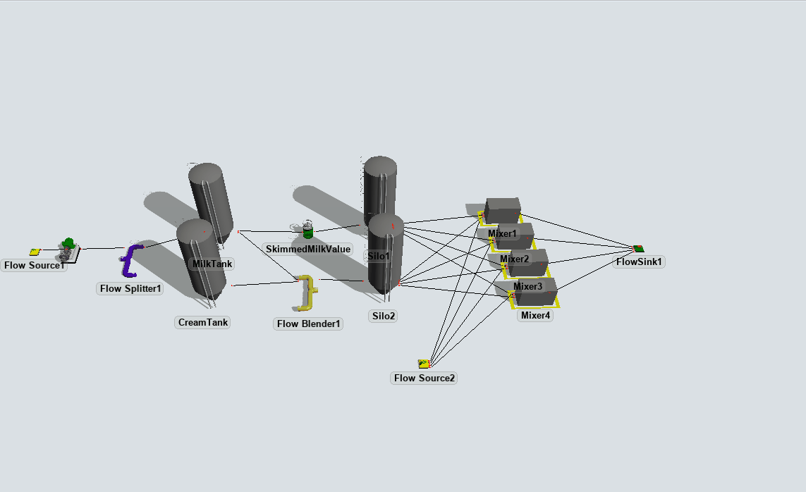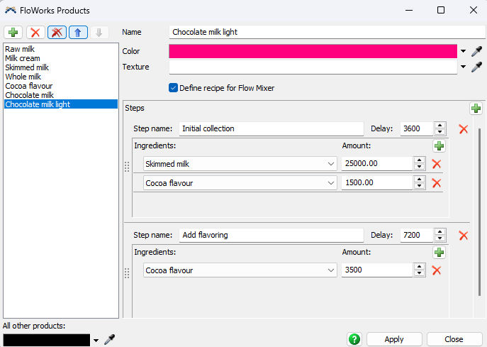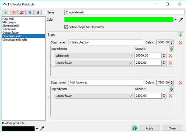 Rather than defining the product recipes for chocolate milk on each mixer separately, you can define them on a product level in the FloWorks product table. This has the additional advantage that you will be able to load different product recipes onto any mixer during the model run.