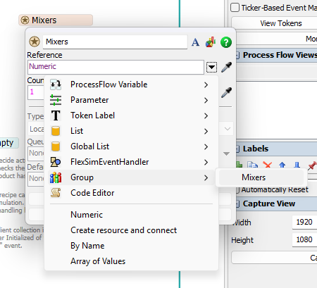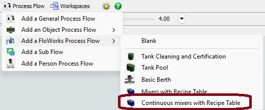 From the Process Flow button on the toolbar, select “Add a FloWorks Process Flow”, then select the “Continuous mixers with Recipe Table” option.
