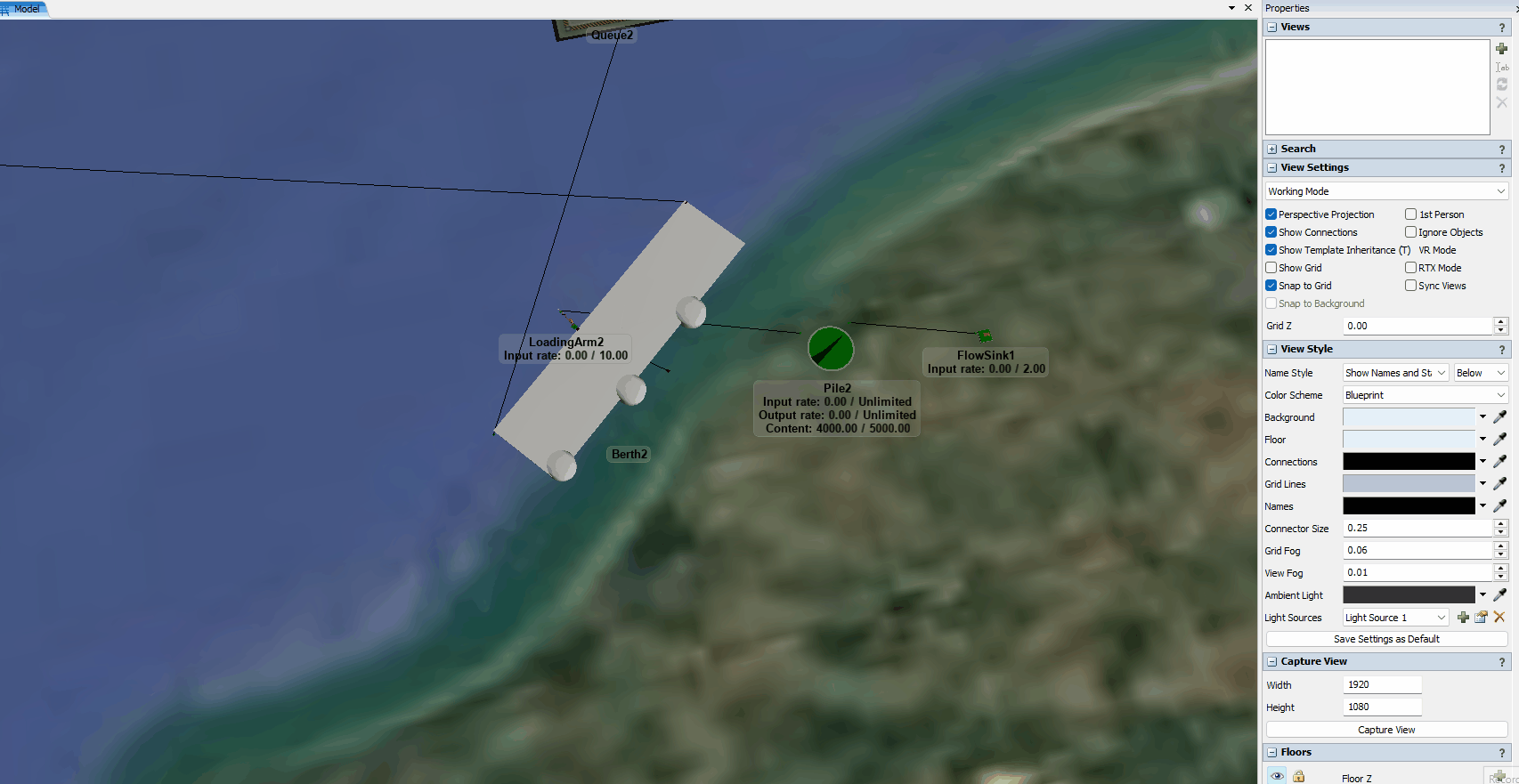 To support loading of a secondary product, you will first have to duplicate the infrastructure for a single product you have created in the previous task. Select all the flow source, flow pile, loading arm and – if you have added it – deferred production sink at the production site, by holding down Control and clicking the objects. Making sure you have not selected the berth or port queue, copy the objects and set their product type to 2 (only the product type of the stock pile is relevant).
