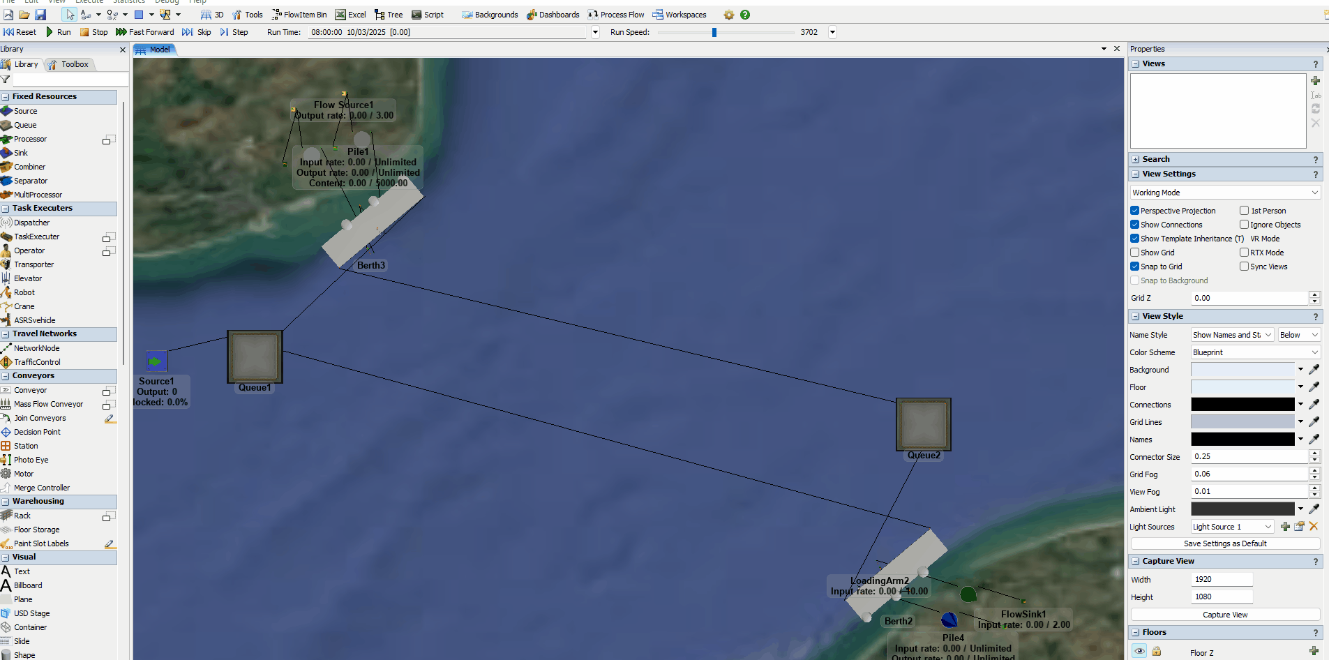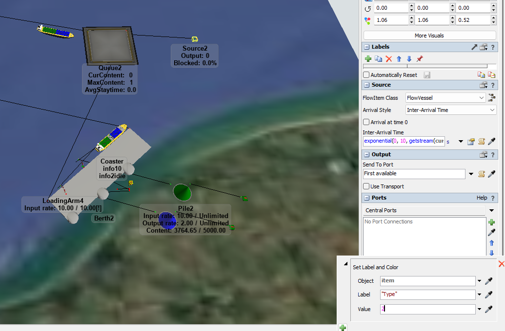 When you run the model now, you will regularly see a loading vessel interfere with the pattern of the unloading vessels, blocking the berth and reducing the green stockpile. Consider it an exercise to add a second third-party type which only loads the blue product, or if you are up for a challenge, perhaps randomly select one of the two compartments to fill.