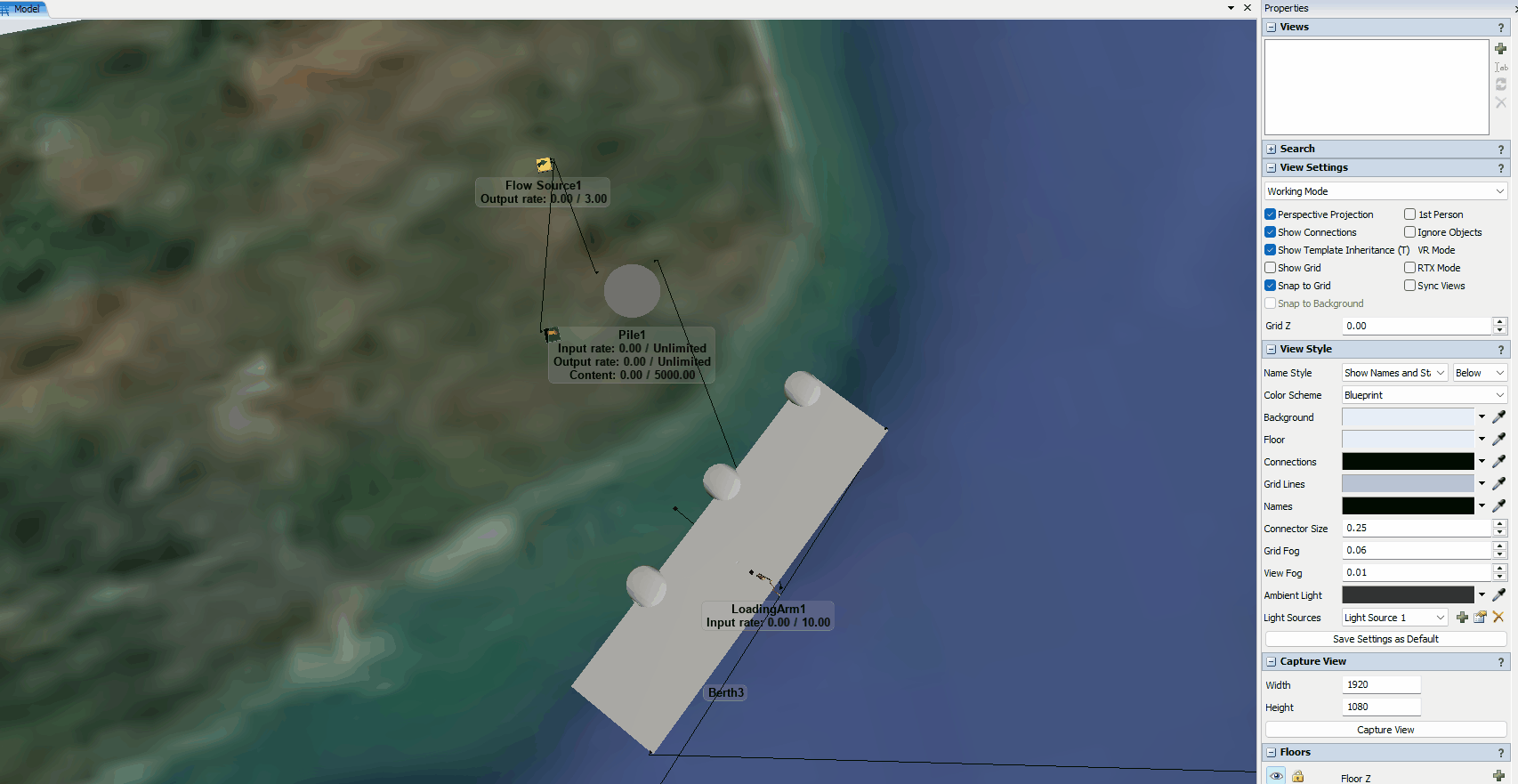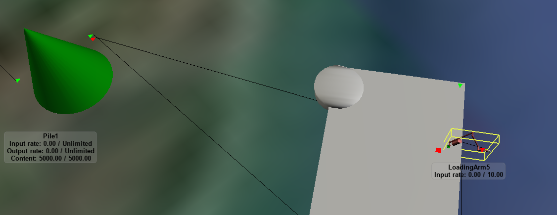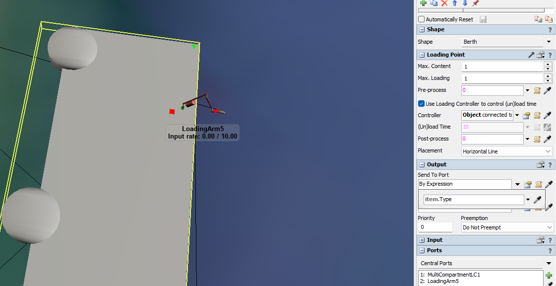 At the consumption berth, you’ll need to add a loading arm for loading the vessel. Add a loading arm, connect the green stock pile to it, and center connect it to the berth.