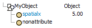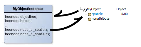 たとえば、空白のノードを考えます。そのノードにオブジェクトデータを追加すると、エンジンにObjectDataTypeのインスタンスが作成され、ツリー内のノードはそのインスタンスをポイントします。次に、ツリー内のオブジェクトに「spatialx」というノードを追加し、そのオブジェクト属性を再バインドすると、エンジンは一致するメンバーポインターを「spatialx」ノードのアドレスに割り当てます。「spatialx」ノードは、独自のデータ5.00をポイントします。