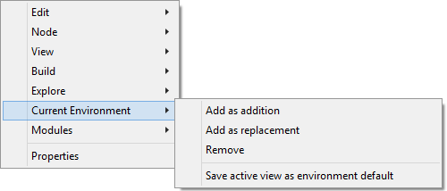 環境にノードを追加、または置き換えるには、その環境を開いている必要があります。環境が開いている状態で、ツリーのノードを右クリックすると、[現在の環境]メニューオプションが表示されます。現在の環境が存在しない場合、このオプションは無効になっています。