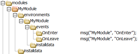 モジュールに環境を追加するのはごく簡単です。モジュールノード(MAIN:/modules/SomeModule)で、environmentsという名前のノードを追加します。このノードはモジュールのinstalldataノードの兄弟です。このノード内に、環境の名前を持つノードを作成します。この環境ノードには、モジュールと同様にinstalldataノードが含まれている必要があります。このノードは、環境の追加と置き換えを格納するために使用されます。最終的な構造は次のようになります。