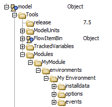 モデルの環境を定義する場合も、modulesノードと同じ構造に従う必要があります。これは、将来の開発において、モデルがモジュールと同様に独自の変更をFlexSimに適用する可能性があるため、それに対応するためのものです。