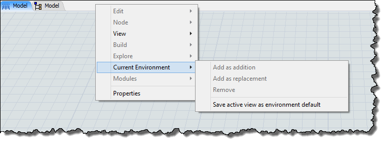 モデルの環境が存在する場合、その環境には通常と同様にノードの追加と削除を行えます。ただし、環境のワークスペースは保存できません。これは、モデルが現在のワークスペースを保存するためです。このため、縮小版のインターフェイス、たとえば単純なメニューとツールバーだけのものを作成するには、次の操作を行います。まず、モジュールの環境の場合と同様に、ノードを追加および削除し、環境オプションを設定します。次に、OnModelOpenにユーザーイベントを追加し、モデルが開いたときその環境に切り替わるようにします。最後にUIを、必要なウィンドウのみが開いており、正しい位置に置かれた状態にセットアップします。その後で、モデルを保存します。モデルを開くと環境が適用され、ワークスペースが復元されます。