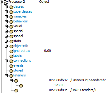 このプロセッサは、自分のイベントをListenerObjとSink3にブロードキャストします。プロセッサのすべてのイベントは、Sink3に信号を送信します。特定のリスナーに信号を送信するイベントをフィルタリングするには、リスナーノードに数値データ付きのサブノードを追加します。指定する数値データは、どのイベントをリスナーに通知するかを示すビットマスクです。上記のフィルタの値は128で、SM_ACCEPTイベントのみを送信します。C++では、ビットシフト演算子を使用して、このビットマスクフラグを作成できます。たとえば、resetイベントとgiveイベント(例:フローアイテムがプロセッサから退出する)の両方を通知可能にするフラグを作成するには、次のフィルタを割り当てます(C++で)。